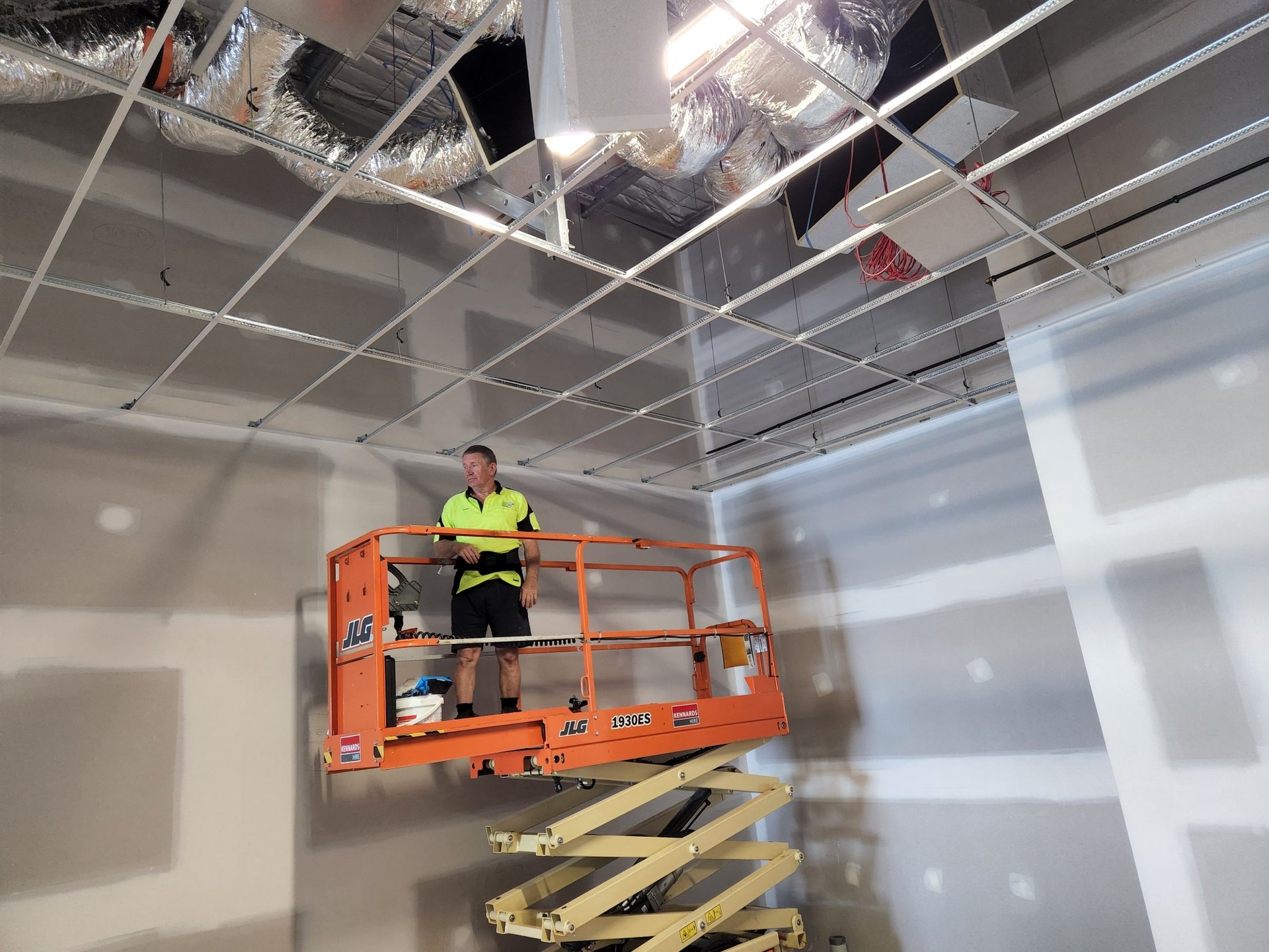 Ceiling Installer on Scissor Lift Brisbane Image of a qualified ceiling installer working at height on a scissor lift during the installation of a commercial ceiling grid in Brisbane.