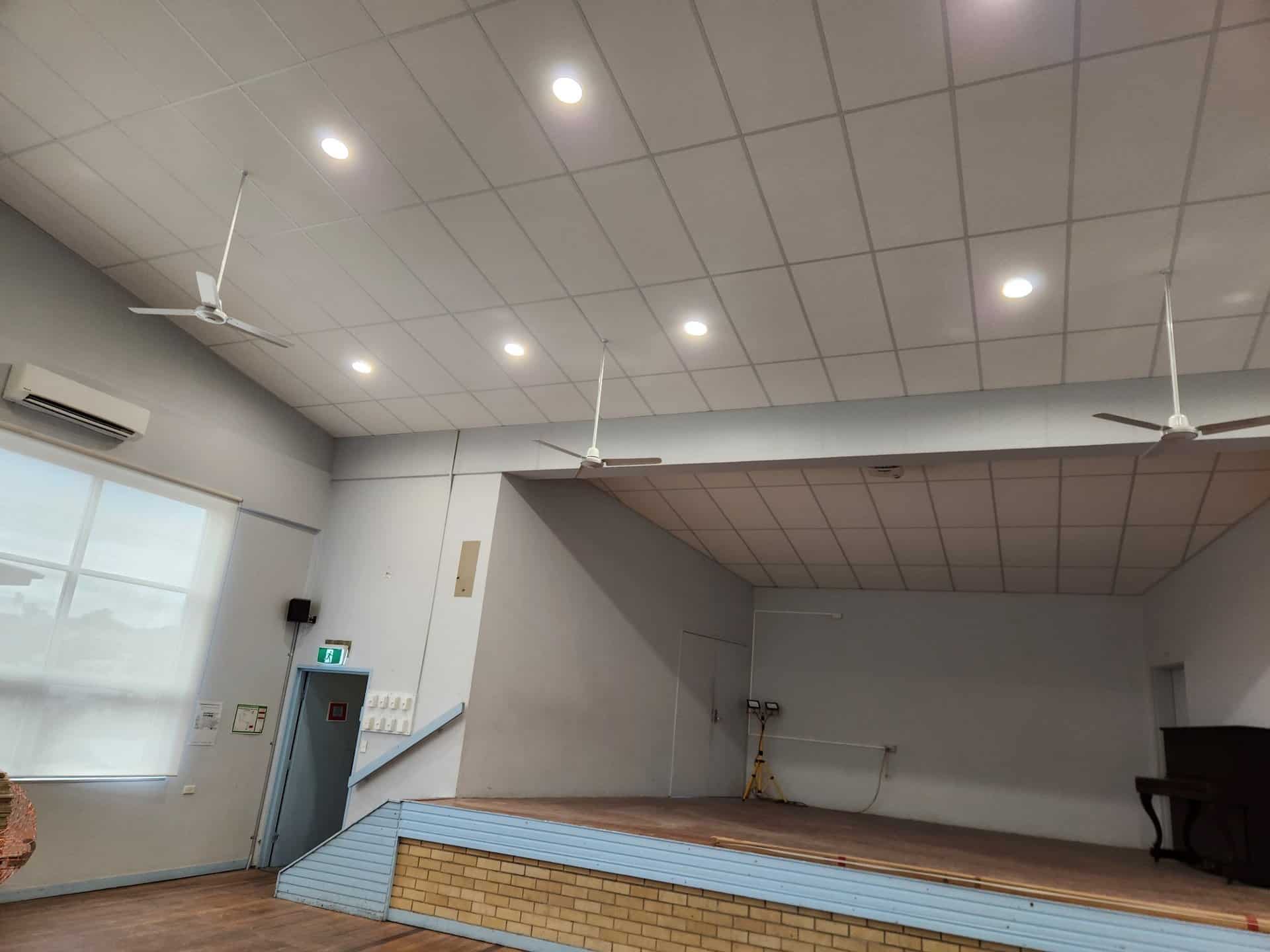 Community Hall Suspended Ceiling Queensland Ceiling installation in a community hall with acoustic tiles, lighting and ceiling fans.