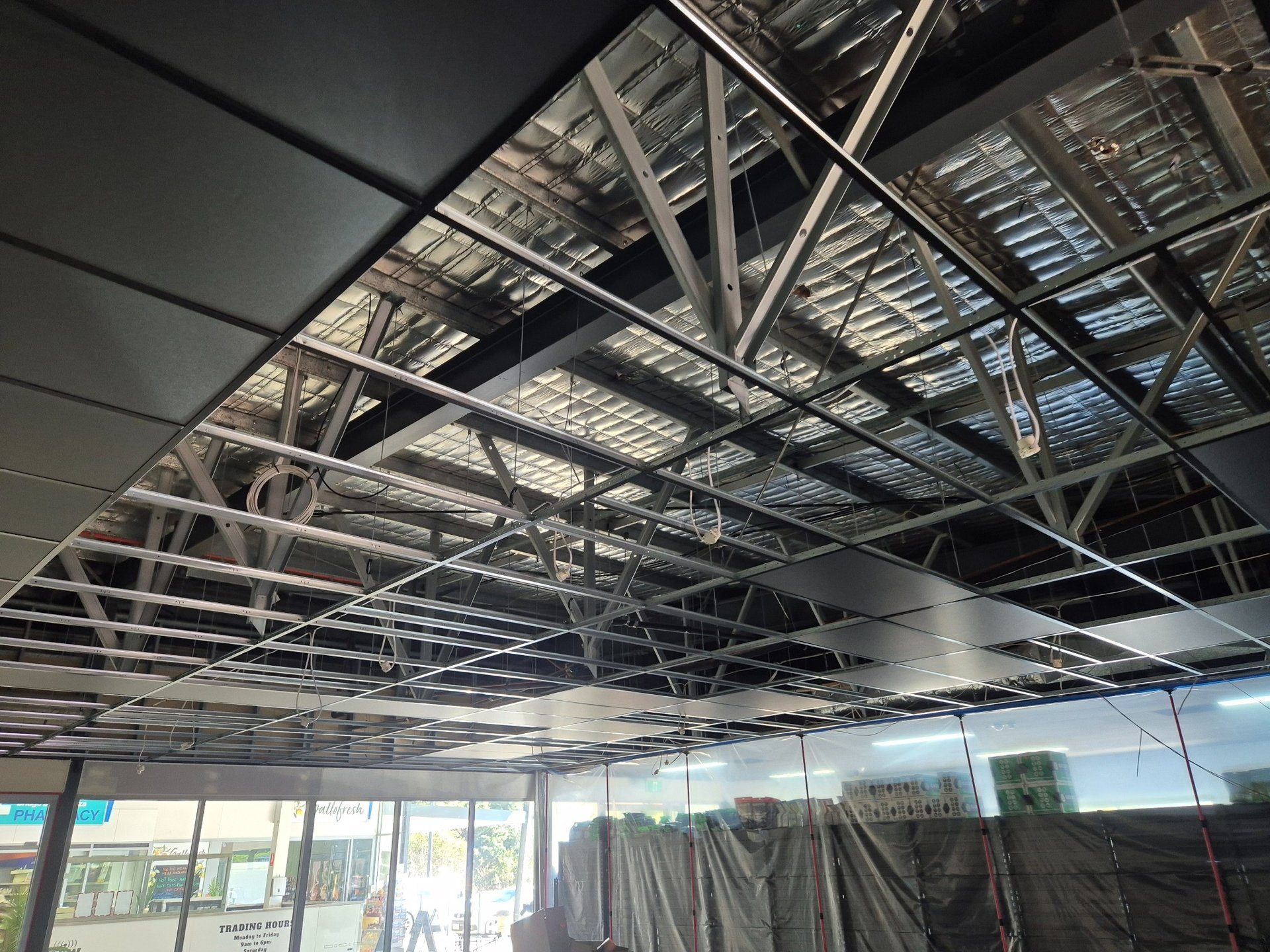 Concealed Grid Framing Under Roof Queensland Image showing concealed suspended ceiling framing under structural roof elements.