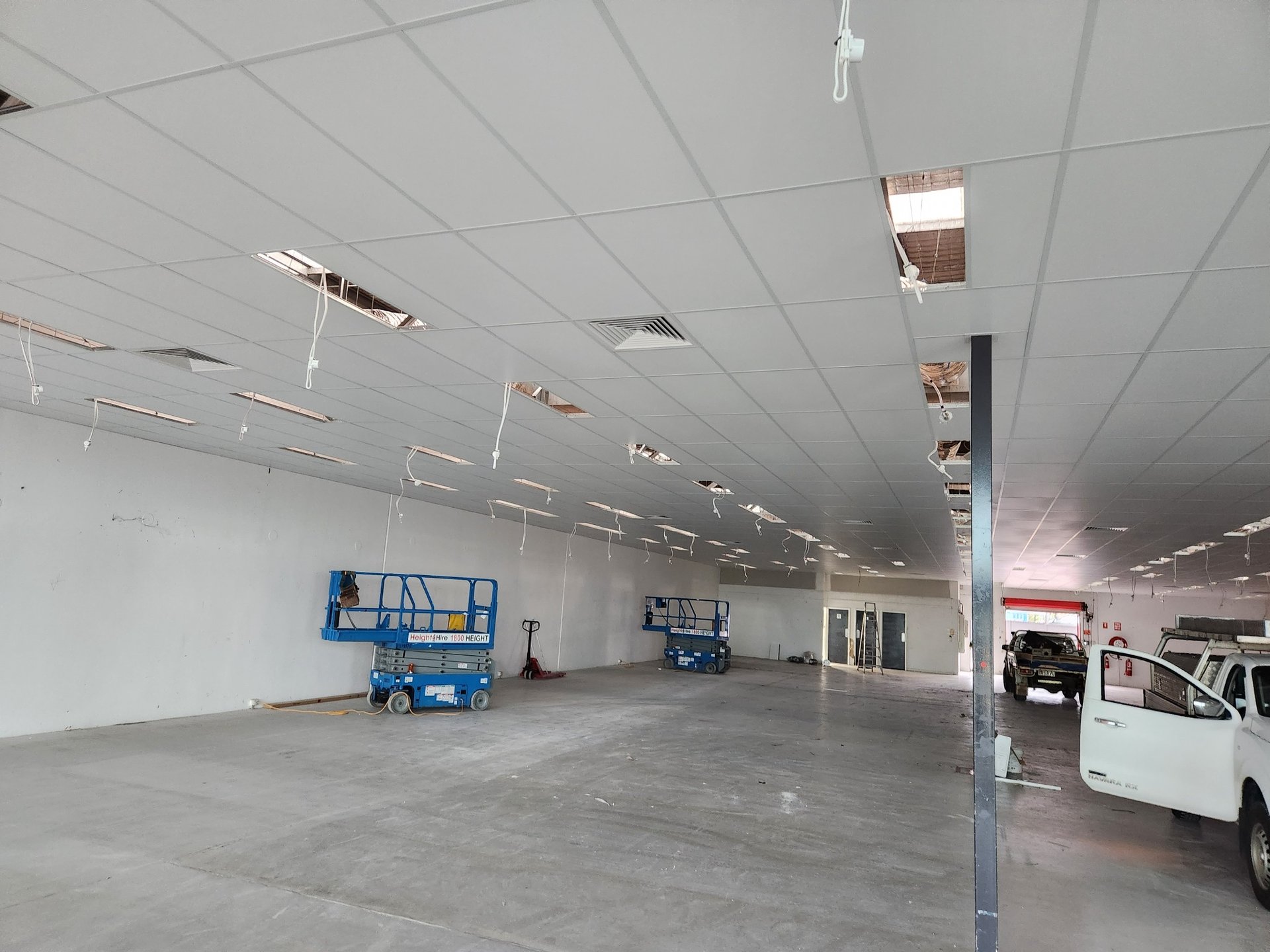 Retail Suspended Ceiling Fitout Queensland Photo of a retail commercial space with numerous ceiling tiles removed, exposing wiring and suspension components. Helps illustrate the complexity and need for compliant installation.